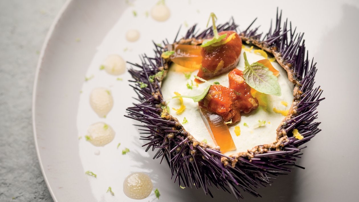 Poser les morceaux de gelée sur les oursins, surmonter avec le corail restant, râper un peu citron Cédrat et finir avec les pousses et quelques gouttes de Vinaigrette Agrumes Maille.