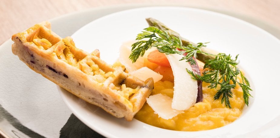 Former un dôme de risotto au centre de l’assiette, disposer les carottes cuites ainsi que les asperges sur le dessus. Rajouter sur le côté la gaufre.