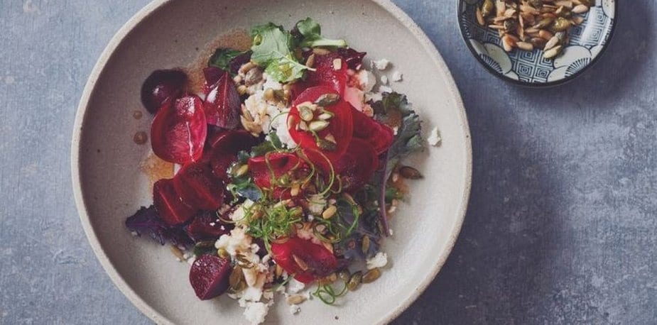 Arroser les betteraves de sauce vinaigrette Cassis-framboise Maille®. Poivrer.Griller les graines et émietter le Sainte-Maure de Touraine.